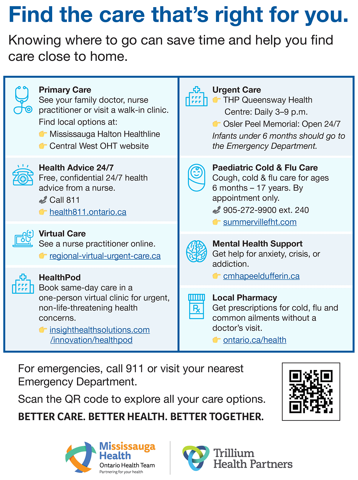 If you do not require emergency care, there are options available to you within the community, based on your needs. Below you will find resources that may be a better option than the hospital’s Emergency Departments.