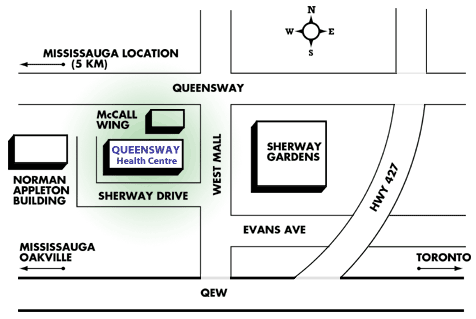 The Queensway Health Centre is located at 150 Sherway Drive, off the West Mall, south of The Queensway, and across the street from Sherway Gardens Shopping Centre.